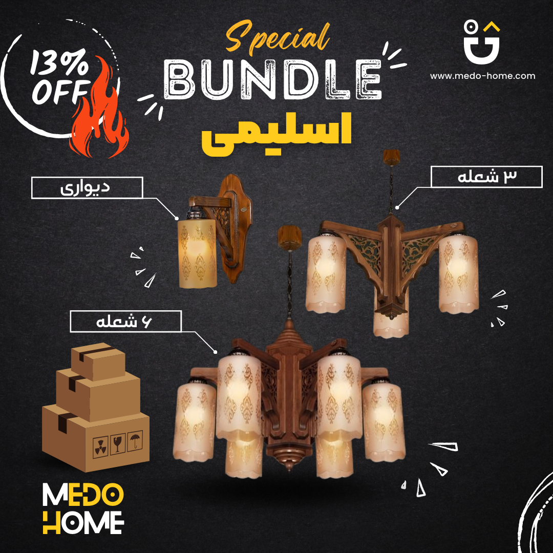 خانوادهی لوسترهای چوبی اسلیمی که تا بحال جزو پرفروش ترین کارهای مجموعهی مِدوهوم بوده و شامل یک عدد لوستر چوبی ۳ شعله ، یک عدد لوستر چوبی ۶ شعله و یک عدد لوستر دیواری میباشد یکی از سِتهای جذاب و زیباییست که به مناسبت فرارسیدن سال نو دارای ۱۳ درصد تخفیف ویژه می باشد.